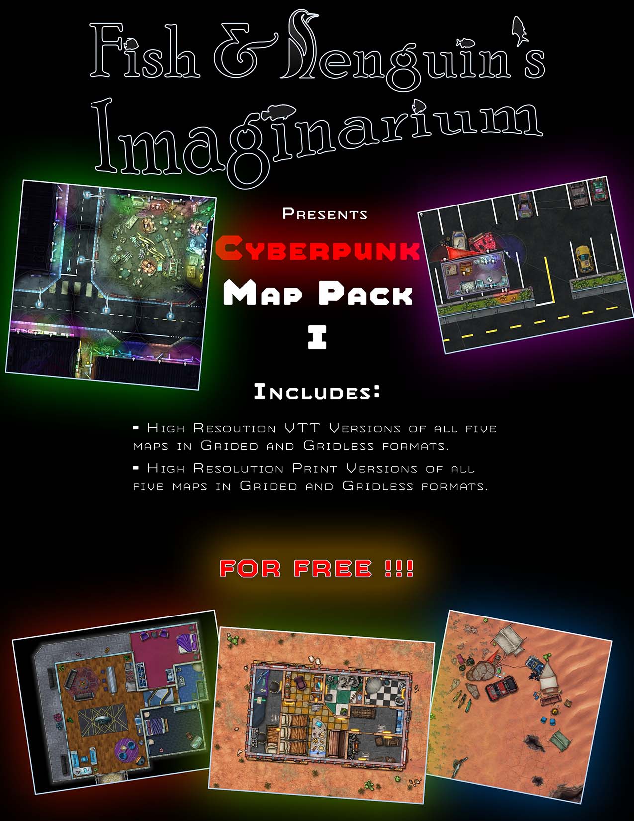 Come one, come all and see! Fish & Penguin proudly presents our very first Map Pack! Come and get this collection of FREE cyberpunk-themed maps for use at your tabletop, virtual or physical.